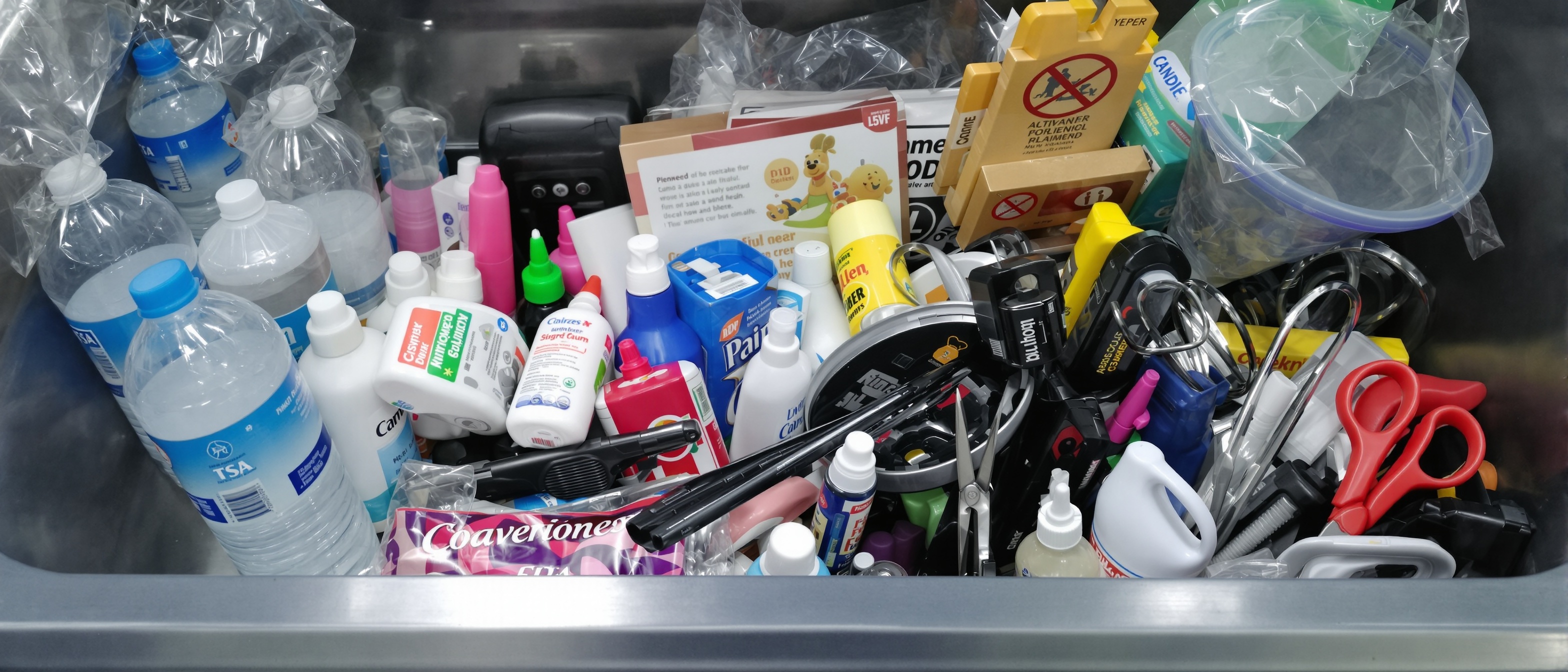 The most commonly confiscated items. Includes water, shampoo, toothpaste, sunscreen, and any substance that can flow or spread.